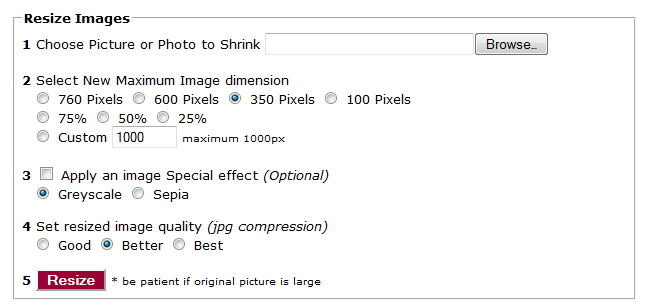 It’s pretty simple to use the service. Click ‘Browse’ to find the image you want to resize you’re your computer. Then, choose the maximum number of pixels (this is width – I like 600 if it’s to be a full width image or 350 for images you need to wrap text around).