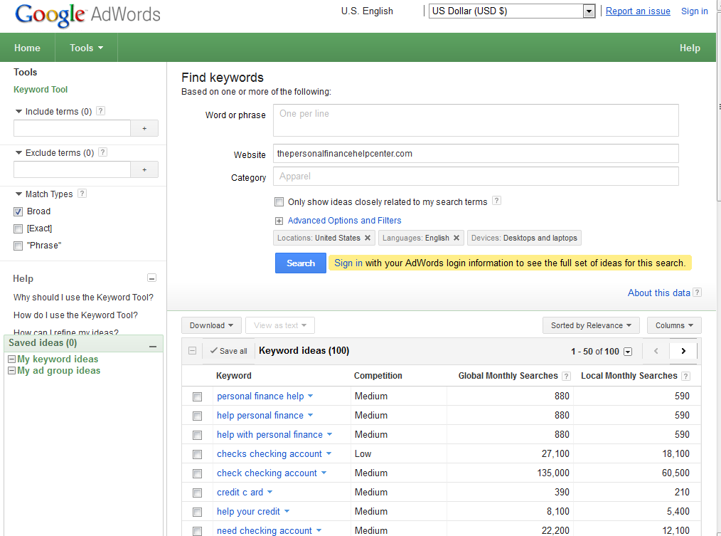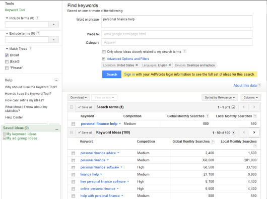 It’s also helpful to check the Adwords tool to find other keywords you might be able to rank for. So for example, here’s what I found for personal finance help: