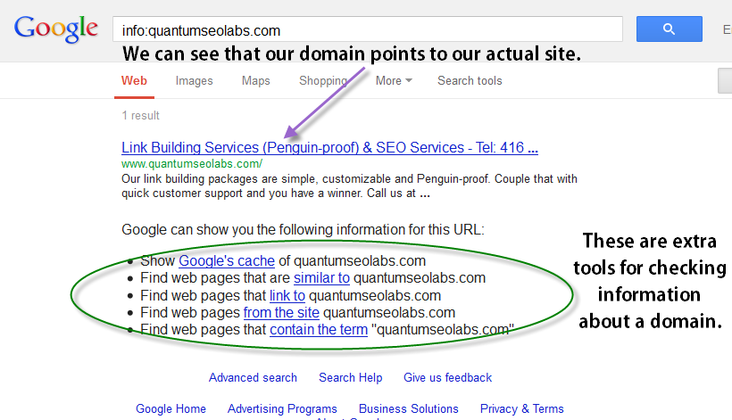 Now, if you use Open Site Explorer, it will detect the redirect and ask you if you want to see what it actually points to. Otherwise, you can also go to Google directly and type in info:domain.com. This will show you whether or not the domain points to what it claims to point to:
