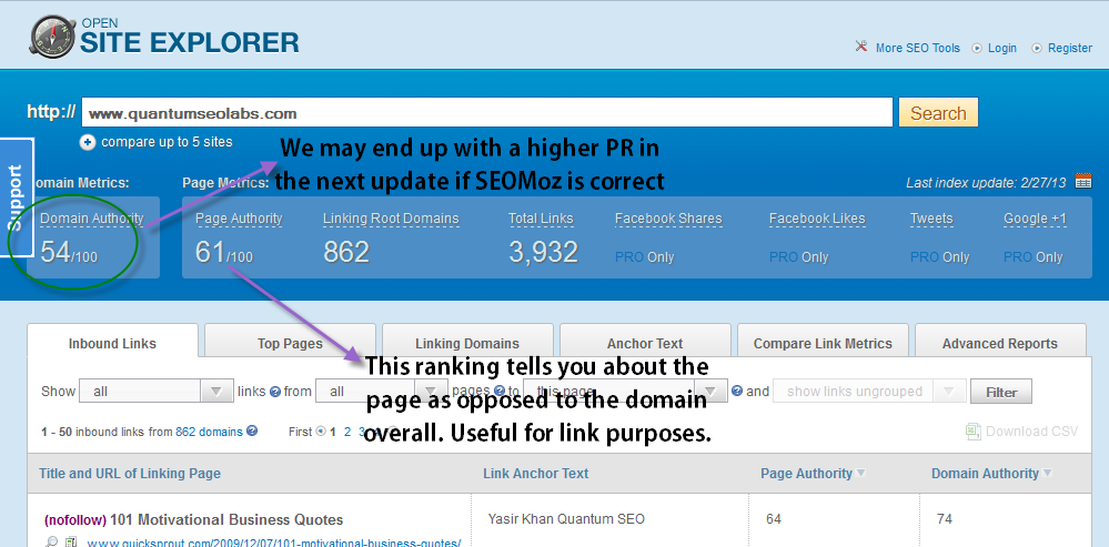 I prefer then to check with Open Site Explorer. The advantage here is that you get a Moz Rank which is updated on a regular basis. Plus, it’s a decimal rank meaning that you have a bit more of an accurate picture of how well your site is doing: