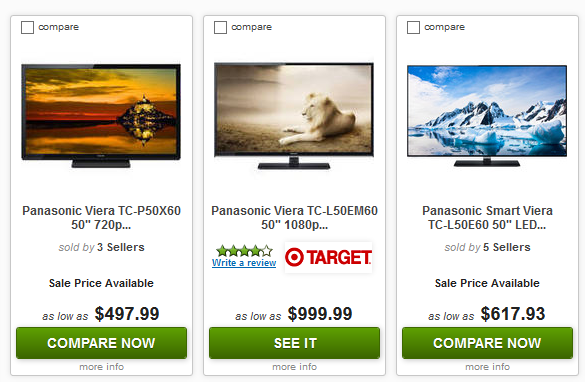 This is a screen grab from PriceGrabber. All three TV sets are 50”. Two of them are 1080P TVs and one is a 720P TV (the one for under $500). Now let’s assume for a moment that the people at Panasonic had crafted this and that all three TVs (all of them are in fact from Panasonic) were being sold on their store’s website. Which one is likely to sell the most? If you guessed the one for $617 you’d be correct.