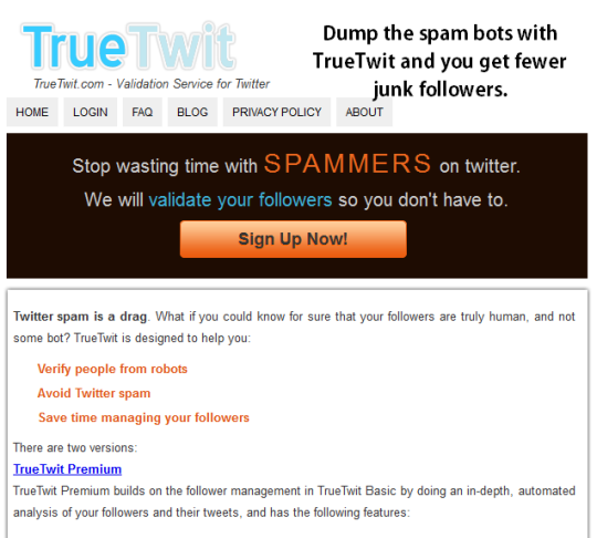 Oh and also, it’s possible to have Twitter reject many of those spam bots by using a service which will require users to verify themselves before they can follow you. This ensures that the automated services which follow 20,000 people at a time hoping to attract some worthless Twitter followers will not waste your time.