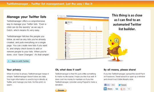 Twitlistmanager is a nice little service which allows you to manage your Twitter lists and to more easily create new ones. While it doesn’t appear to have the ability to automatically create lists based on keywords, the service at least can fetch a list of all those you follow and then allow you to create a custom list based on that.