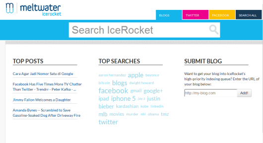 This one is also a pretty cool service to keep around. Ice Rocket is a blog search engine. It lets you find current articles across millions of blogs which are focused on your particular subject area. This allows you to quickly locate blog posts on major sites which feature some mention of your niche.