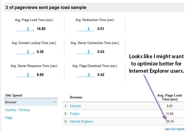 I found out when I glanced at Site Speed for example that IE users are having a very bad experience when visiting my website while Chrome users see it load up reasonably fast. I’ll need to do some investigations to figure out why the speed is so different between different browsers but armed with this knowledge, I can potentially improve the user experience and as a result increase the number of customers.