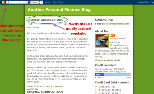 It has not been updated in years and even when it was being updated, all the updates were short without much content useful to the general public (it appears it is mostly personal musings on the guy’s own problems – nothing wrong with that, but not really an authority site). In addition, the site is hosted on Blogger which is a dead giveaway for a non-authority site. Again, no offense intended to the owner.