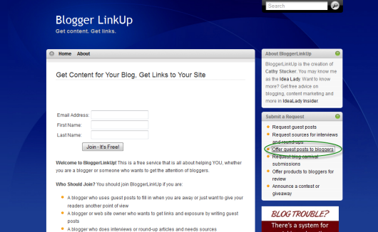 The first and easiest way to put guest posts onto authority sites is to hunt them down on guest post aggregation websites. For example, Blogger Link Up offers a nice free service where you can find sites looking for guest posts: