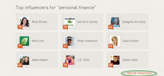 The search term should be fairly generic for your niche. I again chose “personal finance.” Within seconds, Klout will show you a list of the top influencers in your area of interest:
