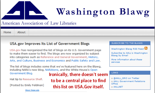 Now finding these blogs and other sites is both easy and difficult. There is a site, usa.gov, which is an index to everything offered by the federal government. They used to have a list specifically of government blogs but I have been unable to find it when researching this post. Fortunately however, I ran across a helpful blog post on another site which has an index to some of the government blogs available: